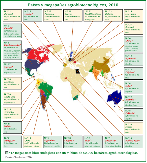 Por otra parte, el número de países productores de cultivos biotecnológicos pasa en este último año de 25 a 29, ya que en 2010 tres nuevos países, Pakistán, Myanmar y Suecia, plantaron cultivos biotecnológicos oficialmente por primera vez, mientras que Alemania (sí, lo han leído bien, la Alemania ecológica también llamada la verde Alemania) reanudó su producción gracias a la patata almidonera «Amflora» recientemente autorizada en la Unión (la primera autorización de este tipo en 13 años).