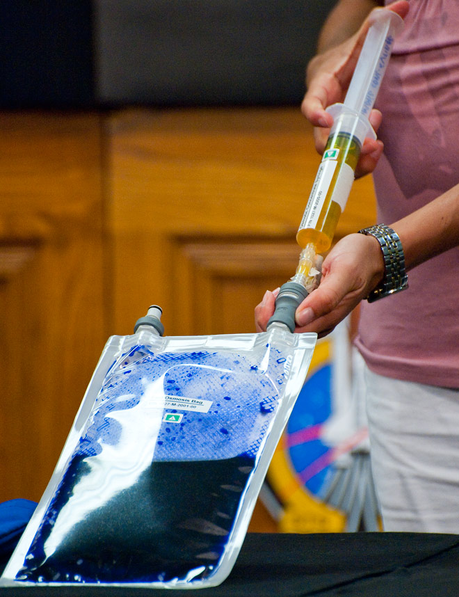 Por este motivo, los tripulantes del Atlantis pueden llenar la Forward Osmosis Bag con su orina y la presión osmótica hace que las moléculas de disolvente se filtren para luego mezclarse con una solución de azúcar concentrada, sin necesidad de electricidad, calor o agitación.
