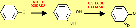 Esta reacción es llevada a cabo, en sus dos primeras etapas, por una enzima llamada polifenoloxidasa (también conocida por catecol oxidasa) que se encuentra generalmente en los cloroplastos de las células vegetales la cual, a través de dos pasos, convierte los monofenoles presentes en las vacuolas de dichas células en difenoles y, posteriormente, oxida estos difenoles a ortoquinonas. Finalmente, y a través de una reacción química, estas quinonas se convierten en esas manchas oscuras (melaninas) que todos hemos visto en manzanas, patatas, peras, etc.