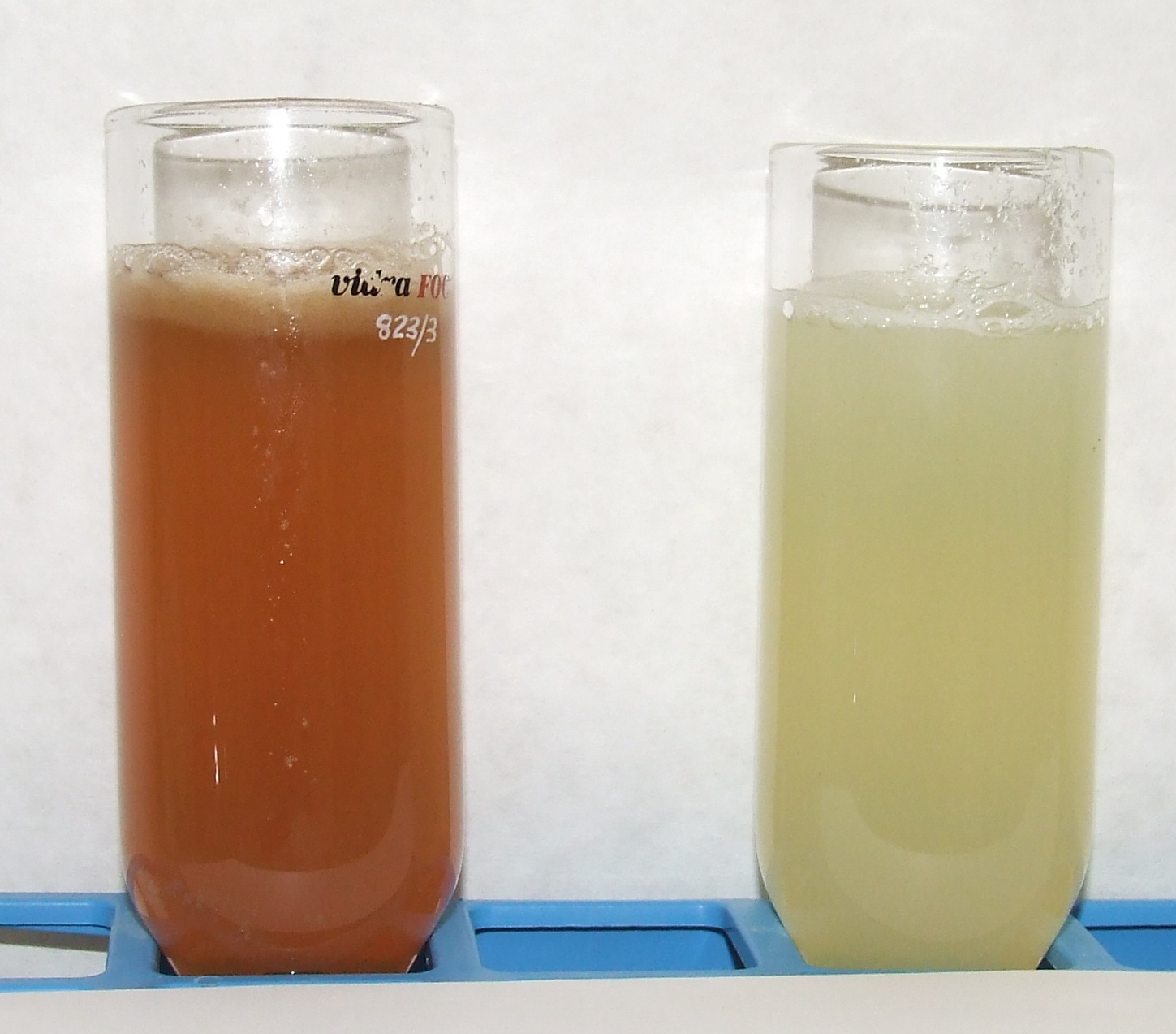 Zumo de pera sin (izq.) y con (der.) ciclodextrinas