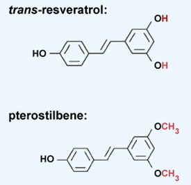Sin embargo tengo que reconocer que este personaje cuyo nombre significa en sindarin, la lengua élfica, “hoja verde”, era más inteligente que sus amigos los Hobbits, enanos, hombres y demás perdedores…. si Légolas consumía arándanos era por algo más que por mejorar su visión o curar sus infecciones urinarias. Un estudio bromatológico de la composición del arándano muestra como esta fruta es rica en un compuesto llamado pterostilbeno, una molécula muy peculiar de la familia de los estilbenos cuya estructura es muy similar a la del archiconocido resveratrol pero con un solo grupo hidroxilo libre ya que los otros dos se encuentran metilados.