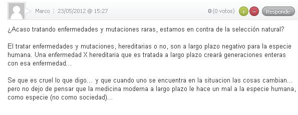 Me parece que la opinión de Marco es de un carácter intolerablemente eugenésico.¿No deben sobrevivir los chiquillos con enfermedades raras? Si al tal Marco le naciera un hijo con la enfermedad de Gaucher o cualquier otra que pudiera tener tratamiento, ¿acaso iba a decir que no quiere que traten a su hijo porque si el mismo llega a edad fértil tendría a su vez hijos enfermos que empeorarían la especie?¡Es vergonzoso!