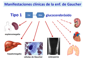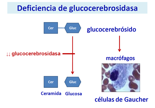 Los pacientes afectados por la enfermedad de Gaucher han heredado dos copias defectuosas (una de su padre y otra de su madre) de uno de sus genes, el que codifica la glucocerebrosidasa, enzima encargada de romper sustancias lipídicas. El déficit de esta enzima provoca que estas sustancias lipídicas se acumulen sobre todo en los macrófagos presentando los pacientes síntomas como anemia, agrandamiento del bazo y el hígado, dolor de huesos y articulaciones, etc.