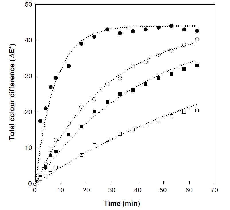 Efecto de la adición de distintas concentraciones de maltosyl-B-CD sobre ΔE* del zumo de manzana a 25ºC. no maltosy-B-CD (●); 30 mM (○), 60 mM (■) and 90 mM (□)