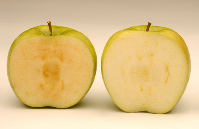 La empresa canadiense, centrada en el campo de la investigación biotecnológica hortofrutícola, ha desarrollado las Arctic Apples, manzanas de las variedades Granny Smith y Golden Delicious en las que se ha producido una modificación genética que afecta a los genes responsables de la expresión de nuestra querida enzima polifenoloxidasa y que da lugar a una significativa reducción en la actividad enzimática de la polifenoloxidasa… lo que se traduce en que estas manzanas transgénicas no se pardean tan fácilmente siendo más resistentes, menos susceptibles de sufrir daños por ligeros golpes y, por tanto, más fáciles de transportar y manipular sin que se oscurezcan tan rápidamente como las manzanas tradicionales. Por otra parte estas manzanas transgénicas podrán ser almacenadas más tiempo en los hogares de los consumidores sin que aparezca el típico rechazo al oscurecerse en pocos días y, en el caso de emplearse para elaborar zumos, estos no se oscurecen.