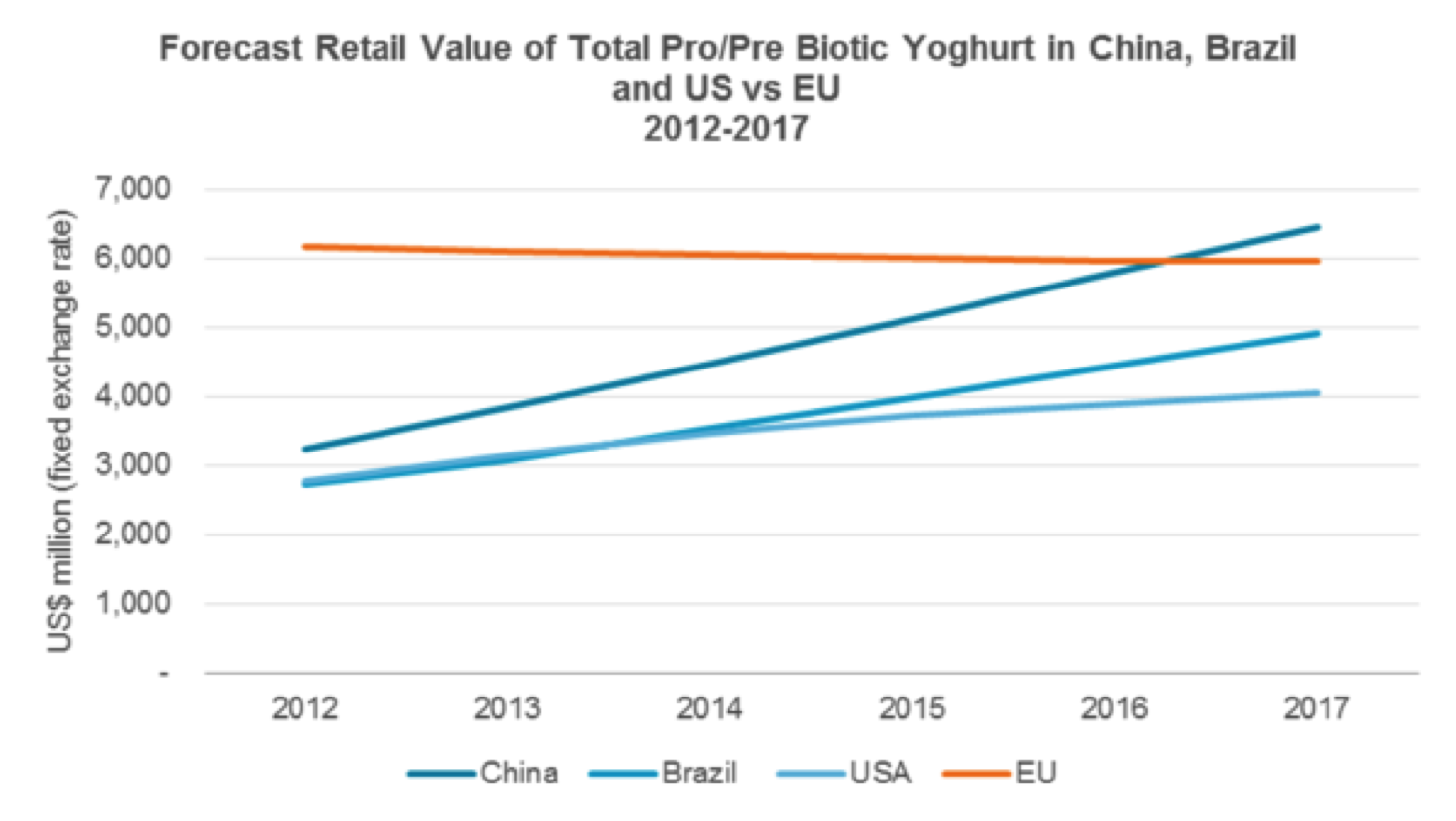 Como pueden comprobar en la anterior imagen la tendencia en el consumo de los alimentos prebióticos y probióticos, como es el caso de Activia, es totalmente opuesta en nuestro continente a la que se puede observar en China, Brasil o EEUU, debido, principalmente, a que en Europa se aplican unos criterios científicos diferentes a los del resto de continentes para justificar la veracidad de una alegación nutricional… y esto no debería ser así.