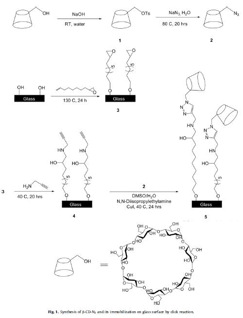 CD fluorescenteLa segunda fase de mi maquiavélico plan consistió en preparar la superficie donde anclar la mono-6-azido-β-ciclodextrina. El soporte elegido fue vidrio, que modifiqué mediante dos reacciones. En la primera cubrí la superficie del vidrio con una “capa epóxido” (compuesto 3) para, a continuación, adicionarle propargliamina  (compuesto 4) y dejarla preparada a la espera de la reacción definitiva con la mono-6-azido- β-ciclodextrina… ¿fácil verdad?