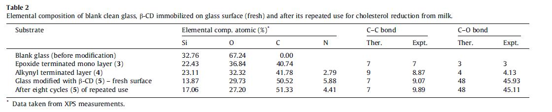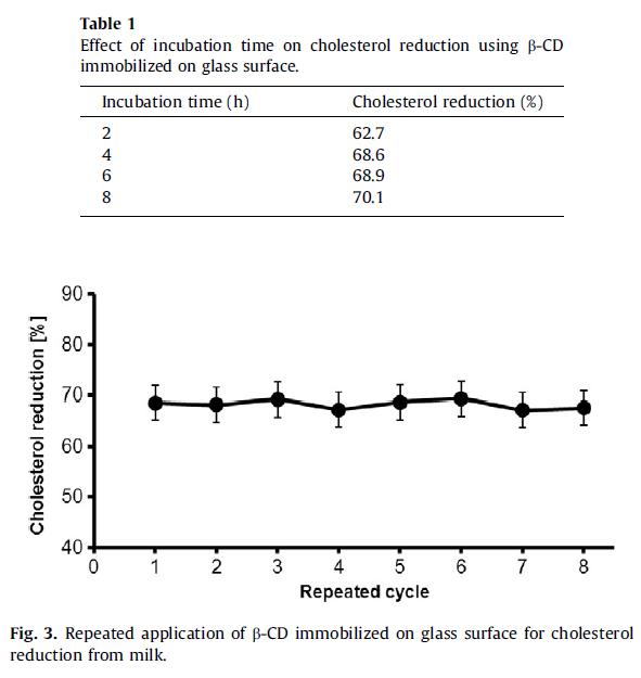 * Inmobilisation of β-CD on glass: Characterisation and application for colesterol reduction from milk. Food Chemistry 139 (2013) 475-481.