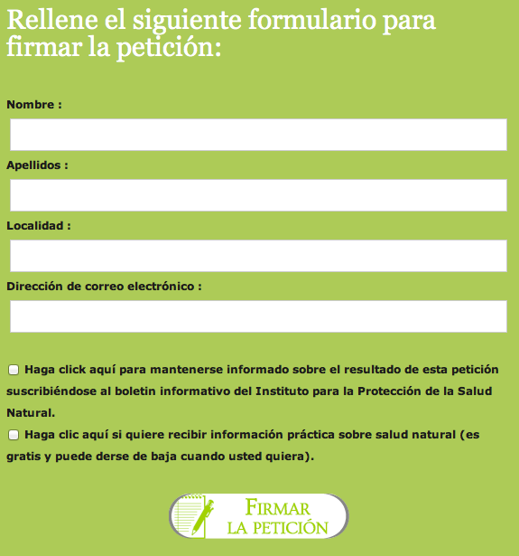Pues bien, el pasado viernes me llevé una gran sorpresa. Un compañero de trabajo, creyendo que me daba una buena noticia, me envió un mail con un link a un video. Según me comentaba mi compañero en dicho video se podía observar como una institución, el Instituto para la Protección de la Salud Natural, no solo apoyaba mi cruzada para que la legislación europea sea anulada sino que promovía una campaña de recogida de firmas para alcanzar “nuestro” objetivo común.