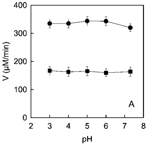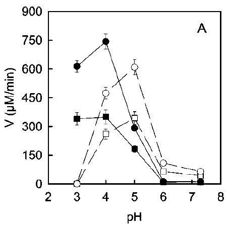 Actividad de PPO ecológica (círculos) y tradicional (cuadrados) a diferentes pHs en presencia de tripsina.