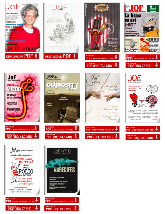 Respecto a los temas abordados en este décimo número de #JoF, en esta ocasión la neurociencia tiene un papel destacado con tres fascinantes artículos. También podrán leer sobre geología, genética, matemáticas, filosofía, antropología, virología, sociología, biología molecular, biología marina, química, anatomía y muchas otras disciplinas científicas. Arrecifes, productos naturales, la ciencia en el renacimiento, virus, la divulgación de la ciencia en los institutos, neuronas espejo… muchos son los apasionantes artículos sobre distintos campos de la ciencia que ustedes podrán encontrar en esta revista bimensual publicada en el mes de Junio.