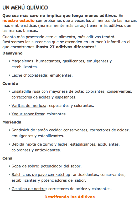 El “menú químico infantil” que constaba de ¡hasta 27 aditivos diferentes! (con negrilla y entre admiraciones) ha sido eliminado. No queda ni rastro de él en la web.