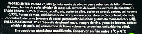 Vegetarianos, no compréis estas patatas. En el cartón ponen que llevan salsa brava, pero en la descripción de sus ingredientes se ve que es realmente una salsa con carne