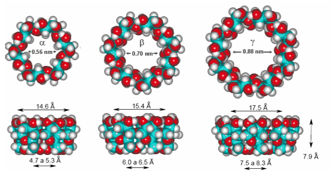 La realidad nos dice que las ciclodextrinas son moléculas muy simples ya que solo se trata de diferentes moléculas de glucosa unidas por enlaces α-1-4-glucosídicos. Estructuralmente, estos compuestos tienen forma de anillo tronco cónico con un interior altamente apolar y un exterior muy hidrofílico lo que le otorga a las ciclodextrinas una capacidad para encapsular, mediante la formación de complejos de inclusión, una amplia variedad de moléculas denominadas moléculas huésped dentro de su cavidad interna.