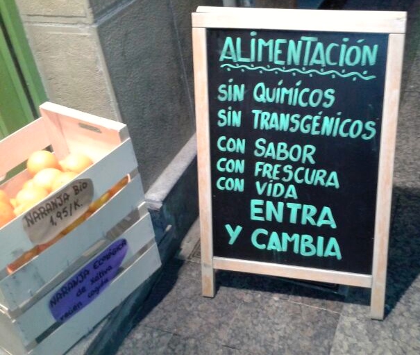 Sin embargo, el post de hoy aborda el tema de los alimentos ecológicos así que centren su mirada en la parte izquierda de la imagen. Junto al surrealista mensaje que aun estoy intentando descifrar de “alimentos con vida” se puede ver una caja de “naranjas bio” al módico precio de casi dos euros el kilogramo… más del doble de lo que cuesta un kilo de naranjas no ecológicas. Por si faltaba poco en la fotografía se puede leer que son “naranjas ecológicas recién cogidas de Xátiva”… a pesar de que se vendan en una tienda de San Sebastián a cientos de kilómetros. No entiendo nada.
