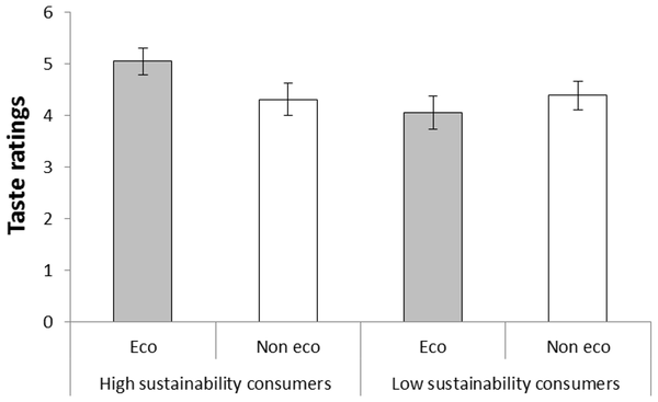 Taste ratings of coffee called ‘eco-friendly’ and ‘not eco-friendly’, respectively, by participants classified as high and low sustainability consumers in Experiment 2, who either took part in an eco-preference condition wherein participants were told that their preferred coffee is the ‘eco-friendly’ alternative or in a non-eco-preference condition wherein participants were told that their preferred coffee is the ‘not eco-friendly’ alternative.
