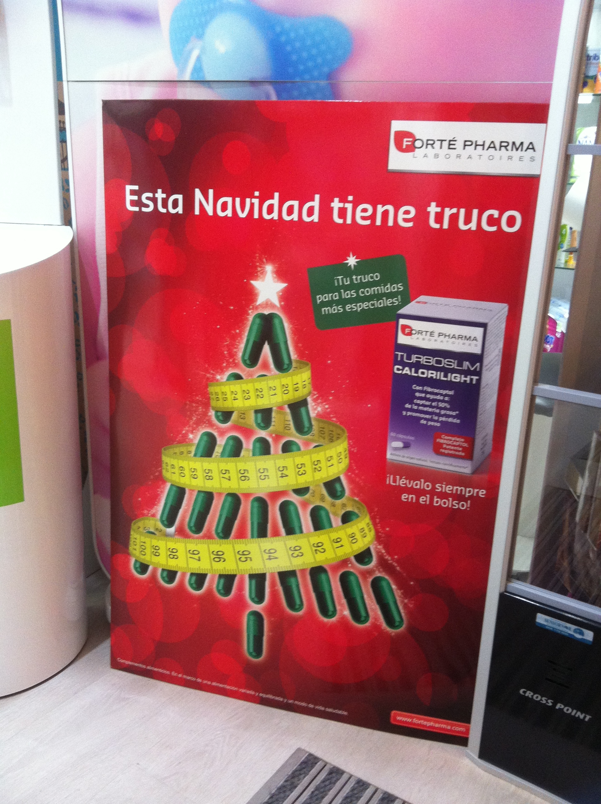 Sin embargo, hice caso del surrealista árbol de Navidad que mi querida madre política tiene en su recibidor y me zampé dos pastillas de TurboSlim CaloriLight de Forté Pharma, ese famoso complemento alimenticio que está en todas los centros comerciales de prestigio de este país y que no ha recibido ningún informe favorable de la EFSA para comercializarse… ni falta que le hace porque parece ser que en este país da igual saltarte la ley a la torera en materia de suplementos.