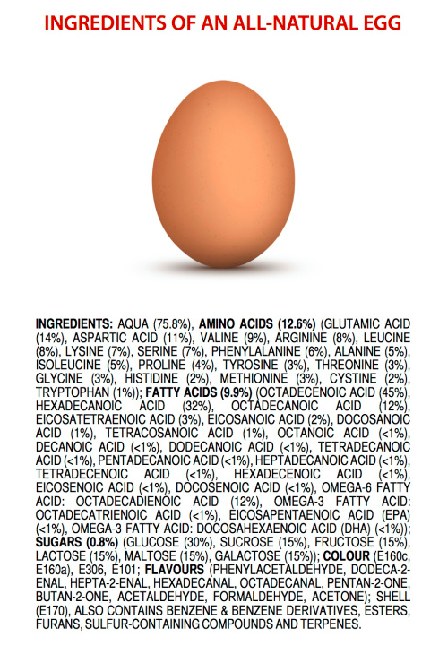 • Por supuesto que influye la alimentación, pero el mensaje del post no es ese. Lo que se intenta poner de relieve es que siempre estamos preocupados por distinguir los compuestos naturales de los químicos y, en el fondo, estamos hablando de lo mismo porque hasta el compuesto más natural (como puede ser un huevo) está formado por infinidad de compuestos químicos. Además muchos de estos compuestos que se encuentran de forma «natural» en el huevo también se usan como aditivos (muy malos para mucha gente) en otros alimentos.