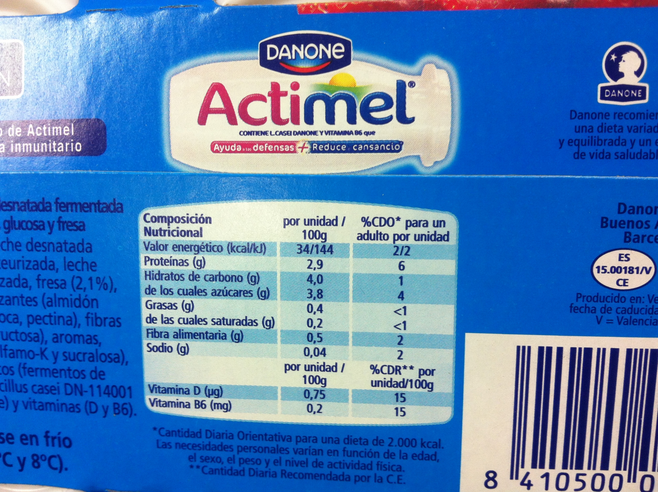 En mi opinión, NO…y esto es grave porgue etiquetar un alimento como 0% si luego resulta que no es de bajo valor energético es de juzgado de guardia. Según dice la reglamentación vigente todos los productos que no contengan más de 40 kcal (170 kJ)/100 g en el caso de los sólidos o más de 20 kcal (80 kJ)/100 ml en el caso de los líquidos pueden considerarse de bajo valor energético. El Actimel 0% es un líquido y en su etiqueta dice que posee 34 kcal. Por ello no puede considerarse un alimento de bajo valor energético. Sin embargo Danone en vez de referirlo a 100 ml lo refiere a 100 g… ¿pero esto qué es? ¿En qué quedamos? La ambigüedad vuelve a presidir, como es costumbre, una etiqueta de Actimel.