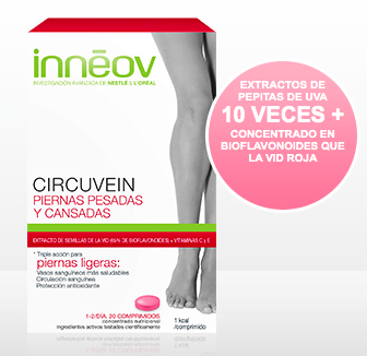 Según leemos en su página web (no lo he encontrado aun en una superficie comercial), “Innéov CIRCUVEIN” debe su éxito a la presencia en su composición de un extracto de pepita de uva que tiene una triple acción sobre la salud venosa, la circulación sanguínea y una protección antioxidante. Pero ¿por qué la fórmula de CIRCUVEIN contiene extracto de pepita de uva? Porque según publicitan dicho extracto desempeña un papel clave en la salud venosa, preservando las estructuras biológicas de las venas.