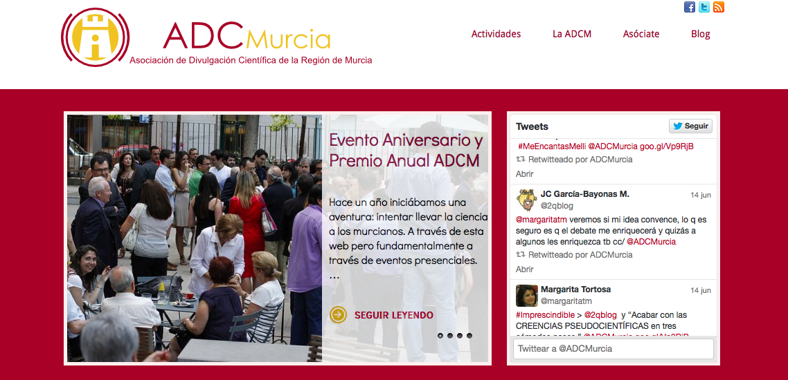 Parece que fue ayer pero ya ha pasado un año desde que se creó la Asociación de Divulgación de la Región de Murcia. Como ya les conté las pasadas navidades, el día de la presentación en sociedad de ADCMurcia en las puertas del Museo Arqueológico de la ciudad fue, sin lugar a dudas, el momento más emocionante del año 2013 para muchos amantes de la ciencia de este rincón del sureste. Ese día se hizo realidad el sueño de un grupo de personas que llevaban ya mucho tiempo reuniéndose para charlar, divulgar, debatir e incluso discutir acerca de muchos aspectos científicos.