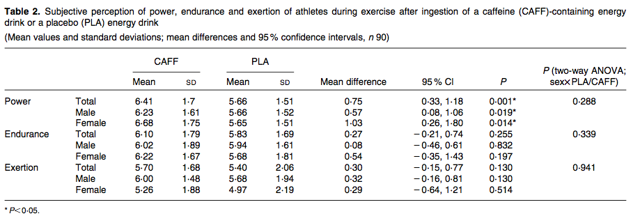 Una vez transcurridos 60 minutos desde la ingestión de la bebida energética normal los participantes completaron una sesión de entrenamiento tras la que se evaluó el efecto sobre diferentes variables. La operación se repitió con la bebida energética placebo. Los resultados mostraron como los atletas, tras consumir la bebida energética, dijeron percibir durante el ejercicio una mayor fuerza, potencia muscular y resistencia que la percibida tras ingerir la bebida placebo.