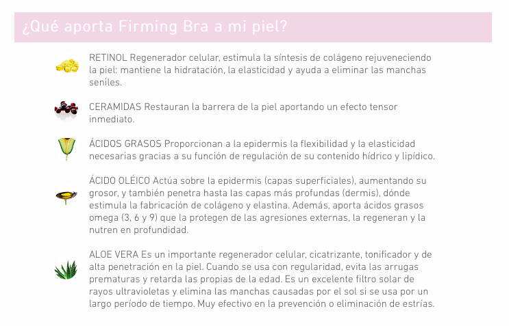 Es posible que ustedes estén pensando que, por lo que les he contado hasta ahora, este sujetador no tiene nada de cosmética inteligente… y llevan razón. Tanto el elastano como las poliamidas son empleadas en la mayoría de los sujetadores por lo que no hay nada de especial. Sin embargo, lo creadores de Firming Bra han empleado en la elaboración de este supersujetador unos compuestos bioactivos de naturaleza hidrofóbica (retinol, ácido oleico, ceramidas, aloe vera y ácidos grasos) que no se encuentran en la composición de otros sujetadores y que son los presuntos responsables de las particulares propiedades de esta prenda. En la siguiente imagen pueden leer los efectos que promete Firming Bra en su web basados en estos compuestos bioactivos.