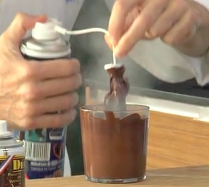 Pues bien, en la elaboración de nuestro plato el tetrafluoroetano lo empleamos para enfriar el chocolate fundido previamente y dar lugar a una trufa. Veamos cómo.