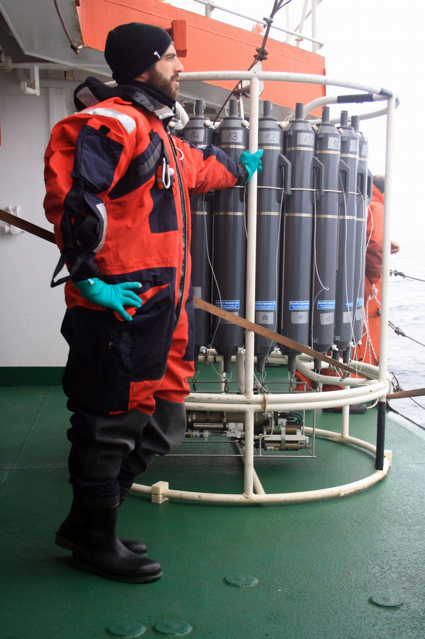 Durante los siguientes días llevamos a cabo el proyecto PEGASO. Jornadas laborales de más de 16 horas (a veces de 24 horas), sobre un suelo que se mueve y una temperatura que siempre rondaba los 0ºC. En el exterior el viento es increíblemente fuerte y frío, y si nieva los copos se clavan como cuchillos en la piel. Si tuviese que elegir entre bata o bota, definitivamente me quedaría con las dos; es más, añadiría que soy más de Viking, el traje de supervivencia polar que me tenía que poner casi todos los días para muestrear agua de -2 a 0ºC entre los hielos antárticos.
