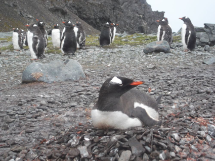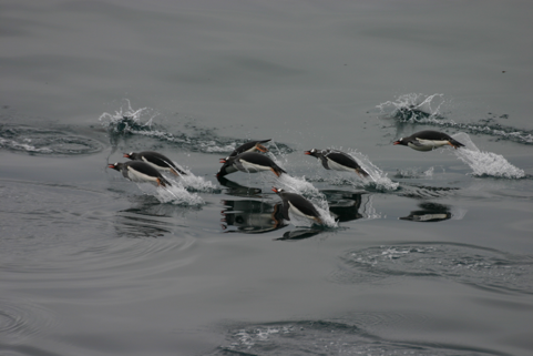 Acompañando a estos primeros hielos flotantes, aparecen también los primeros pingüinos; en concreto de la especie conocida como Barbijo. Me resultó muy curioso verlos por primera vez. Esperas que pasen la mayor parte del tiempo buceando y, sin embargo, van saltando sin parar sacando todo su cuerpo fuera del agua, como hacen los delfines. Suelen ir en grupos de una decena de individuos y son extremadamente curiosos, hasta el punto de subirse a la zodiac mientras los científicos trabajábamos.