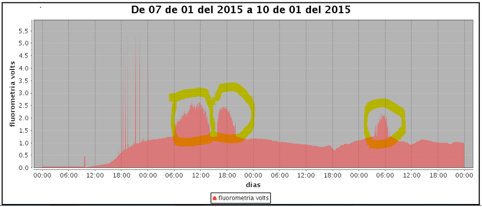 Imagen 5. Datos de fluorímetría proporcionados por sensores en el BIO Hespérides (UTM); rodeado en amarillo picos de zonas con una mayor producción primaria.