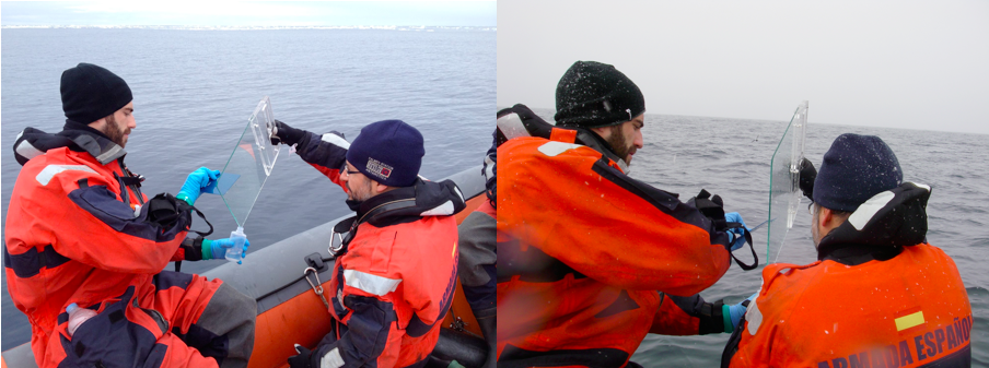 Imagen 8. Muestro de la microcapa superficial océanica, en un día tranquilo (izquierda) y otro con viento y nieve (derecha).