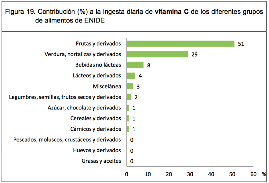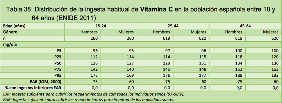 La Agencia Española de Seguridad Alimentaria y Nutrición (AESAN) realizó un estudio de valoración nutricional de la población adulta española evaluando la ingesta de energía, macro y micronutrientes. La estimación se llevó a cabo cruzando los datos de consumo de alimentos obtenidos en la Encuesta Nacional de Ingesta Dietética ENIDE y los de composición nutricional de dichos alimentos, recogidos en la Base Española de Datos de Composición de Alimentos BEDCA. EN el caso de la vitamina C los resultados son contundentes. La población adulta española multiplica entre dos y cuatro veces las ingestas aconsejadas de vitamina C.