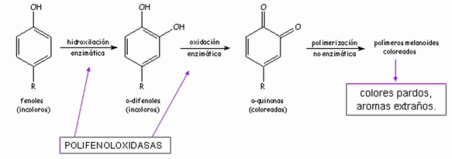 Como ya les he comentado en entrada anteriores, el pardeamiento enzimático es llevado a cabo, en sus dos primeras etapas, por una enzima llamada polifenoloxidasa que se encuentra generalmente en los cloroplastos de las células vegetales. Esta enzima, a través de dos pasos, convierte los monofenoles presentes en las vacuolas de dichas células en difenoles y, posteriormente, oxida estos difenoles a ortoquinonas. Finalmente, y a través de una reacción química, las quinonas se convierten en esas manchas oscuras (melaninas) que todos hemos visto en manzanas, patatas, peras, etc. En el siguiente esquema pueden ver el mecanismo de actuación de la Flecha Negra, perdón de polifenoloxidasa.