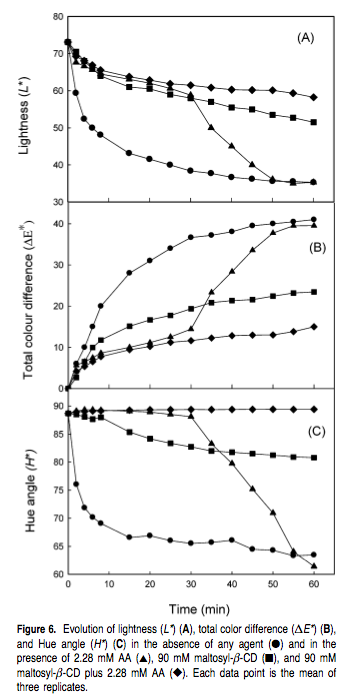 Fuente: López Nicolás, J.M. and García-Carmona, F. Use of Cyclodextrins as Secondary Antioxidants to Improve the Color of Fresh Pear Juice. J. Agric. Food Chem. 2007, 55, 6330−6338