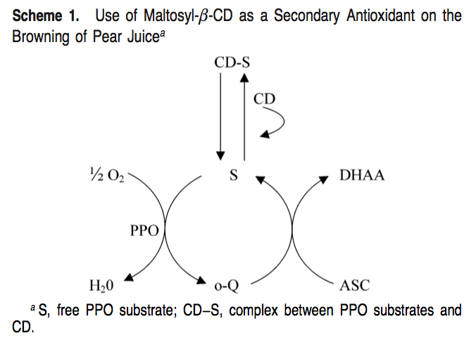 En la siguiente imagen pueden observar el mecanismo de actuación del ácido ascórbico y de las ciclodextrinas como antioxidantes secundarios en la reacción de oscurecimiento del zumo. A Sauron se le saltan las lágrimas.