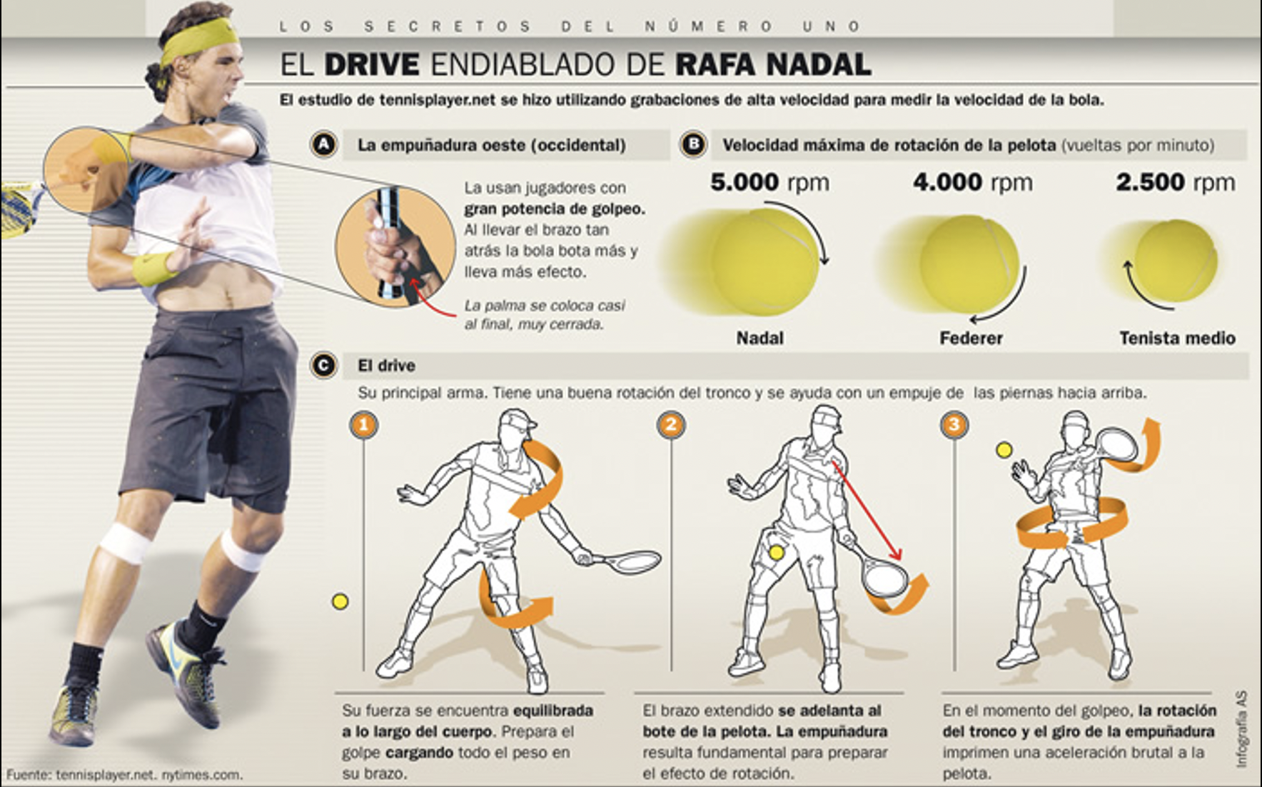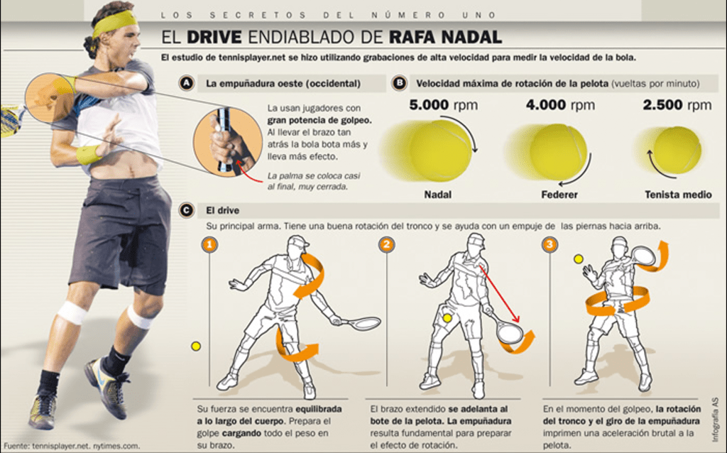 El golpe preferido de la mayoría de los tenistas españoles es el liftado, aquel que lleva una carga de efecto ascendente que ayuda a la pelota a salvar la red y luego a caer en la pista (se ha medido que la “bola liftada” de Nadal puede llegar a las 5.000 r.p.m. mientras que la mayoría de los jugadores consiguen sólo alrededor de 2.600 r.p.m.).