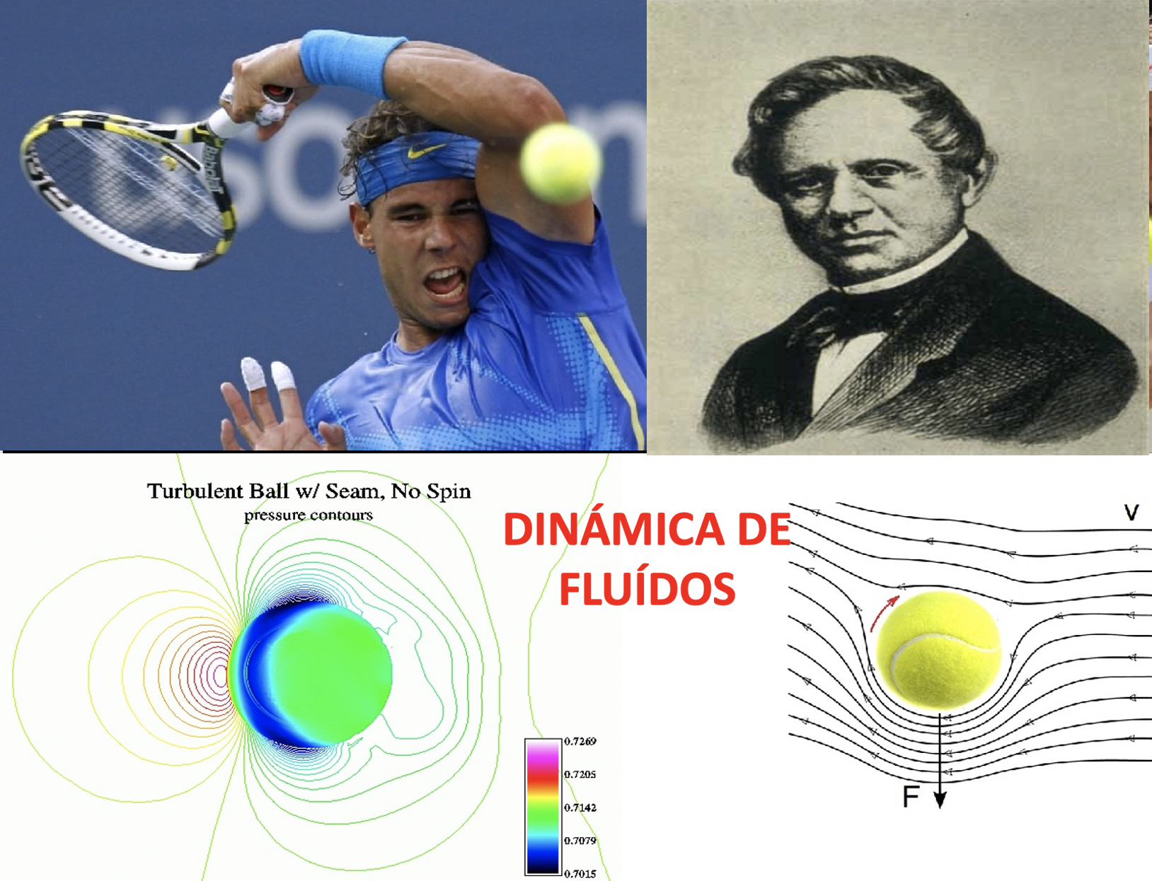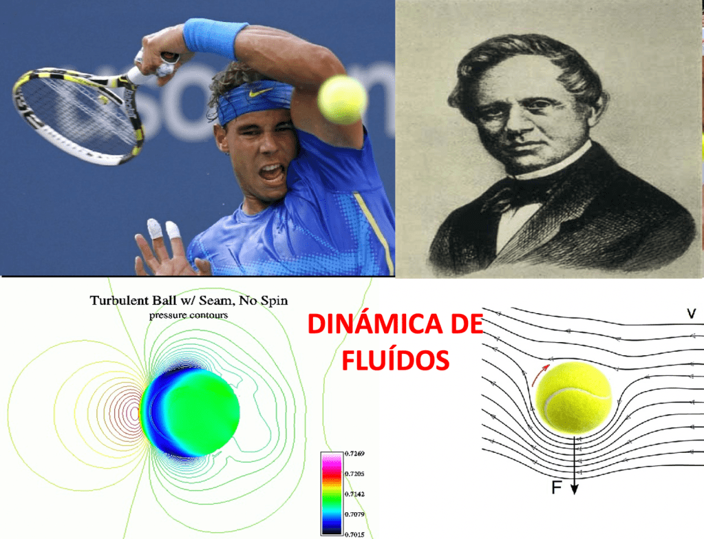 Inicialmente la pelota golpeada por Nadal siguió la primera ley de Newton, según la cual un cuerpo se mueve en la misma dirección y a la misma velocidad hasta que se le aplica una fuerza que lo haga variar de dirección. ¿Qué fuerza fue la que hizo que la pelota cambiara la trayectoria? La mecánica de fluidos nos da la respuesta.