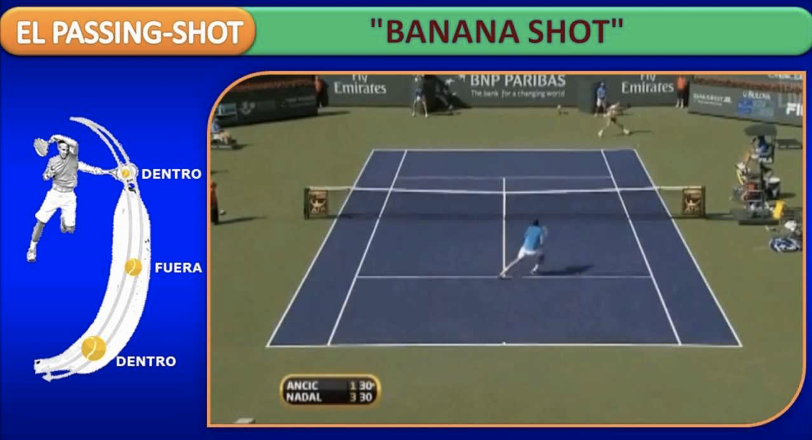 - Finalmente, y en el caso de que el rival haya subido a la red, el liftado lateral (golpeo a la pelota lateralmente con mucho efecto) conocido como “banana shot” ayuda a nuestros jugadores a superar a los contrarios con fabulosos passing-shots.