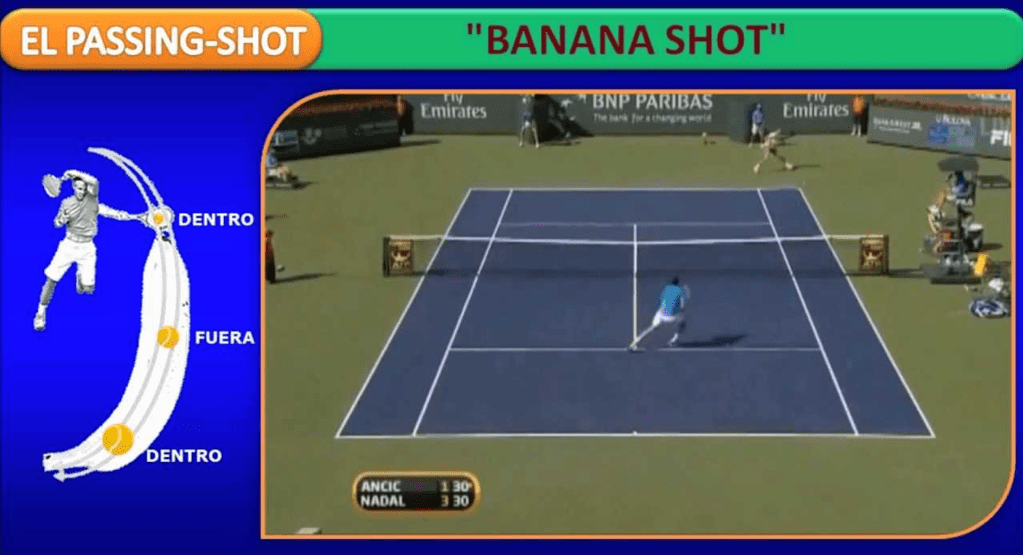 En el siguiente vídeo, correspondiente a un partido entre Nadal y el también español Fernando Verdasco, se ve perfectamente cómo gracias al banana shot la rotación que se imprime a la bola hace que esta siga una trayectoria de fuera a dentro de la pista.