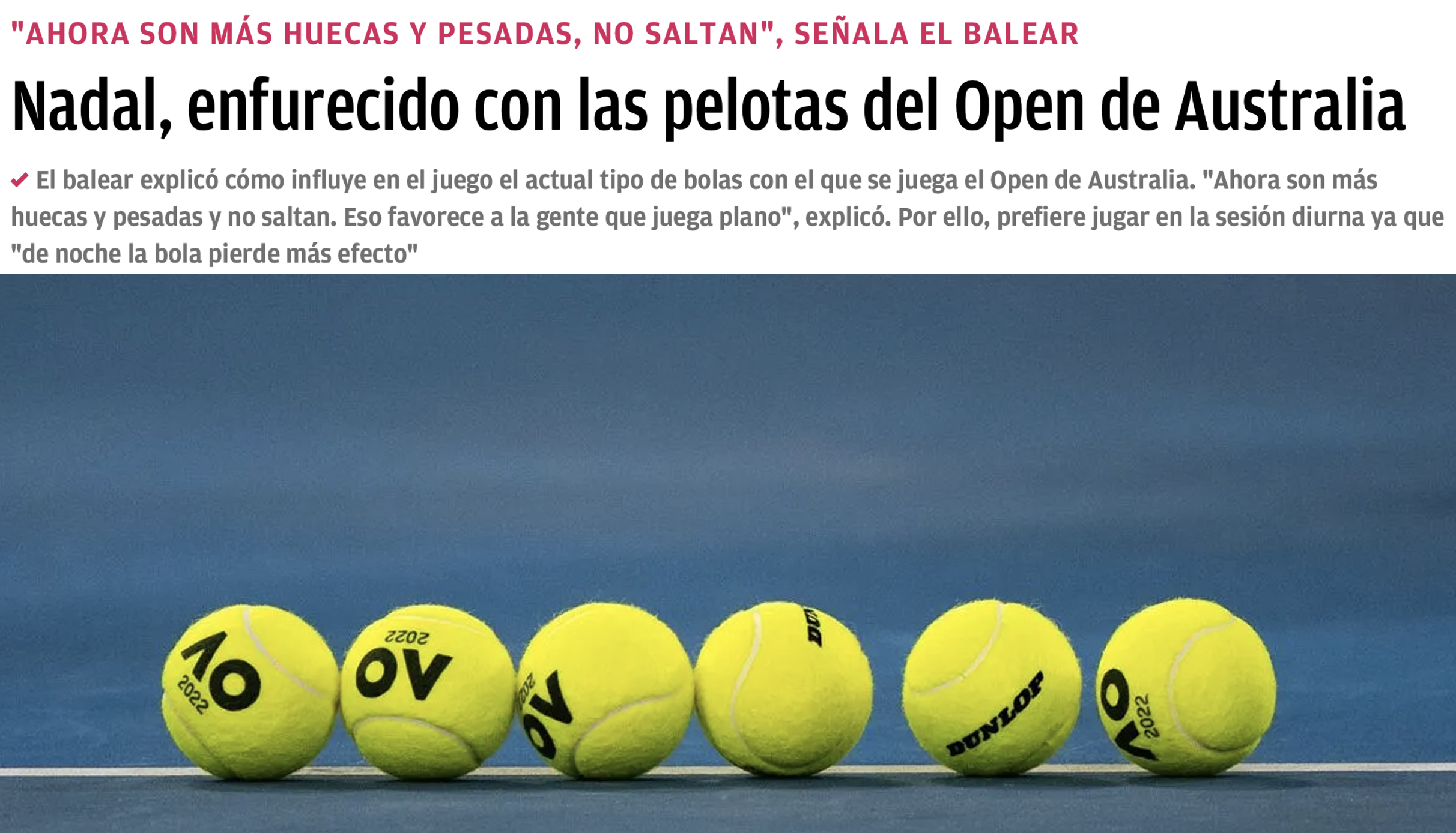 2.- La pelota. Las bolas con las que se juegan el OA son más pesadas de lo habitual, algo de que se ha quejado Nadal reiteradamente. ¿Por qué lo hace? Al no ser tan ligeras como las pelotas empleadas en otros Grand Slam no adquieren la velocidad necesaria para que el Efecto Magnuss tan deseado por los jugadores españoles se manifieste tan significativamente.