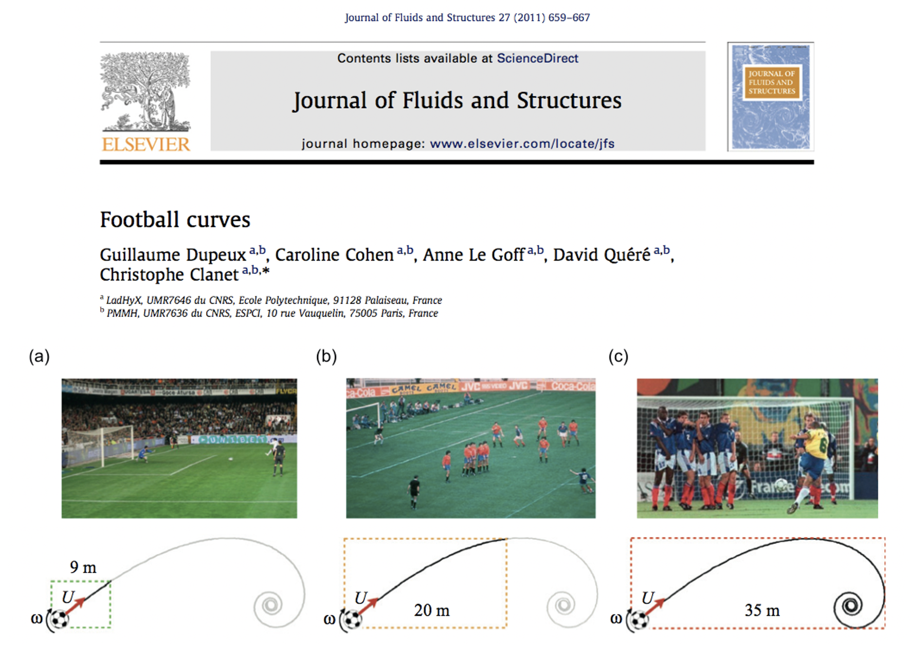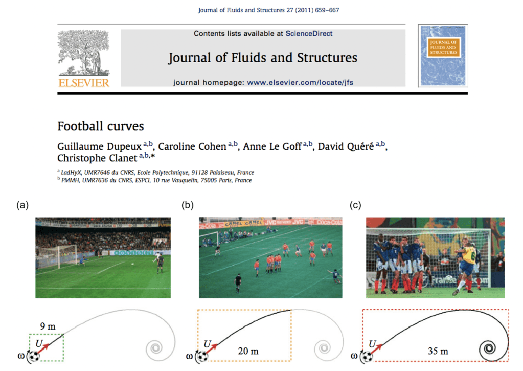 En un trabajo publicado en la revista Journal of Fluids and Structures, científicos franceses simularon este tipo de “trayectorias deportivas” usando como modelo un gol marcado por el brasileño Roberto Carlos. Para ello hicieron experimentos bajo el agua, lo que les permitió eliminar los efectos de las turbulencias en el aire y la fuerza de gravedad. Los investigadores establecieron que la trayectoria que sigue una esfera cuando gira al dársele efecto es una espiral en forma de concha de caracol. Esa espiral es la que destroza a los rivales de los jugadores españoles.