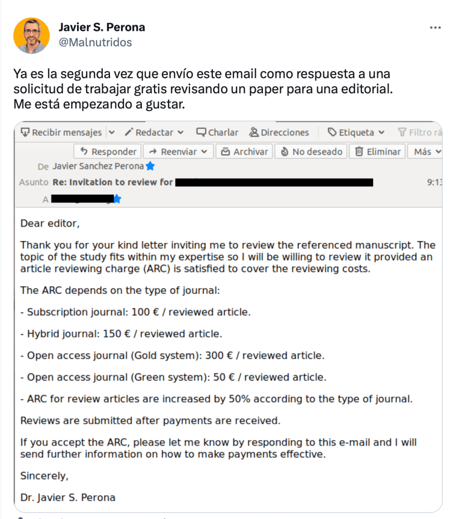 Hace unas semanas se hizo viral la respuesta que Javier S. Perona, investigador del CSIC y de la Universidad Pablo de Olavide, envía a las revistas científicas cuando estas le piden que revise gratuitamente los artículos científicos que los investigadores enviamos a dichas revistas para que sean publicados. En un tweet Javier hizo pública las diferentes tarifas que reclama a las revistas a cambio de su trabajo y que depende del tipo de revista o de artículo. Según ha contado este investigador las revistas jamás le han contestado cuando le ha mostrado tus tarifas a cambio de sus servicios (yo he sido evaluador de varias revistas científicas y tampoco he recibido nada a cambio).