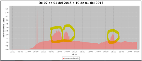 Imagen 5. Datos de fluorímetría proporcionados por sensores en el BIO Hespérides (UTM); rodeado en amarillo picos de zonas con una mayor producción primaria.