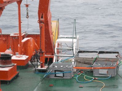 Imagen 7. Zona de experimentos con los tanques de incubación en la cubierta de popa, un día de nevada.